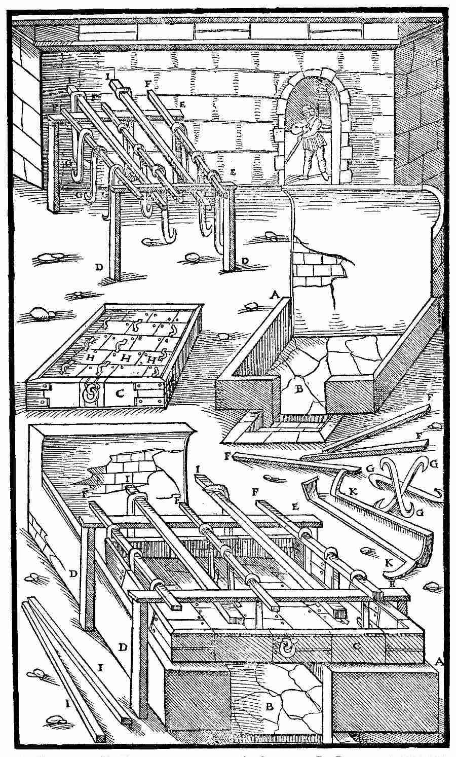 4. Drzeworyt ukazujący narzędzia do warzenia soli, w tym G - haki krótsze, K – haki dłuższe, za: Georgius Agricola De Re Metallica libri XII, Bazylea 1556, s. 445.
